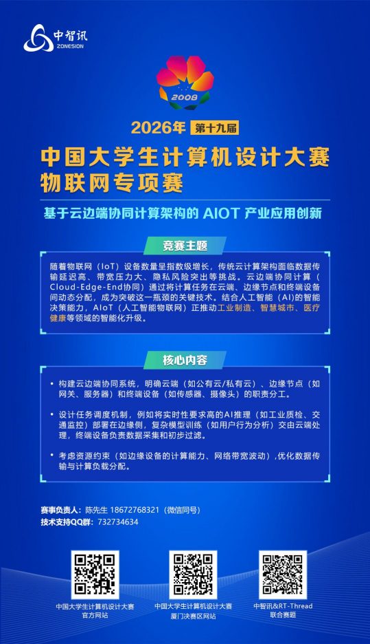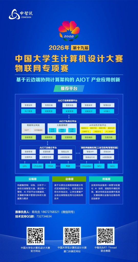 中智讯联合RT-Thread负责大赛物联网专项赛:RT-Thread 竞赛方案,大赛将于2026年4月-8月举行。欢迎大家报名。